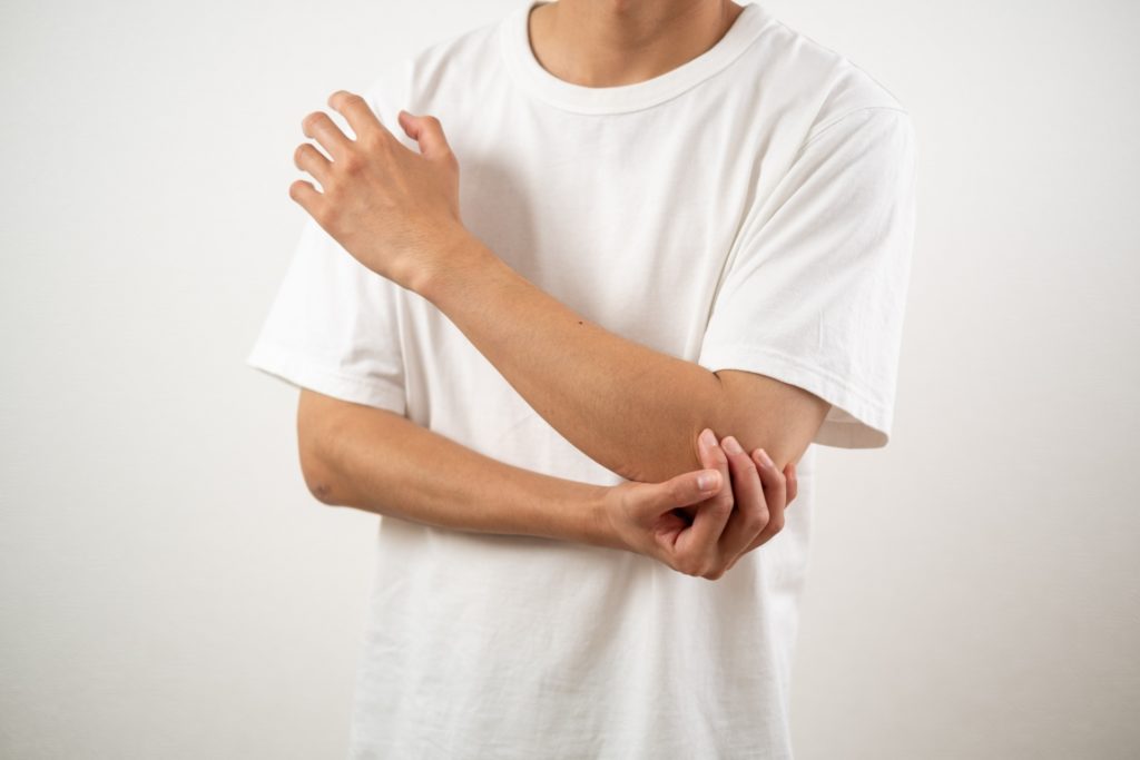 - 肘の内側の痛み:手首を曲げたり、握ると痛みが生じます。特に強く握る動作の時に痛みを感じることが多くあると言われています。また、肘の内側の骨を押すと痛むことがあります。
